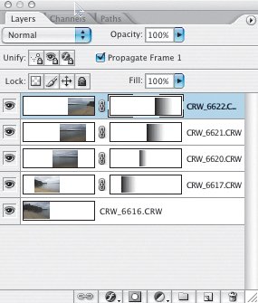 Figure 4.42. The Layers palette showing the layer masks, each with a Foreground to Transparent gradient applied.  | 10. | Inspect the panorama closely to see what details do not marry up exactly from layer to layer. To fix these problems paint on the layer masks with a soft-edged brush. I also used the Healing Brush (j) on a separate layer to fix some problems with the sky.