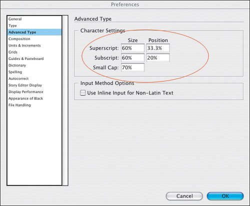 Figure 1.2. Advanced Type Preferences. I recommend changing the Superscript and Subscript preferences to the percentages shown. Superscript and Subscript are discussed in Chapter 3: Character Reference.