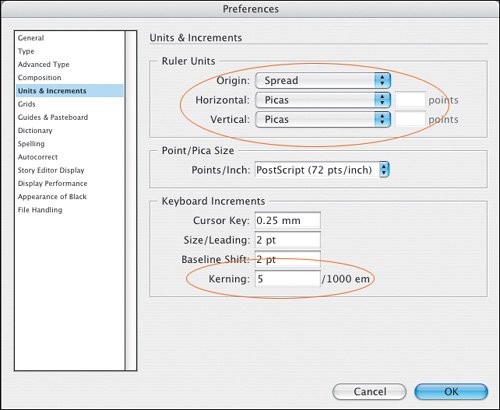 Figure 1.4. Units & Increments Preferences. Horizontal and Vertical Unit of Measurement: Picas. Perhaps not the most logical of measurement systems, but they are the typographic standard. For example, wouldn't you rather have an indent of 1 pica rather than 4.233 millimeters? For a discussion of pica and points see Chapter 6: Sweating the Small Stuff.