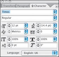 Figures 1.6A and 1.6B. The Control palette in Character Formats view and the Character palette, which offers the same options.