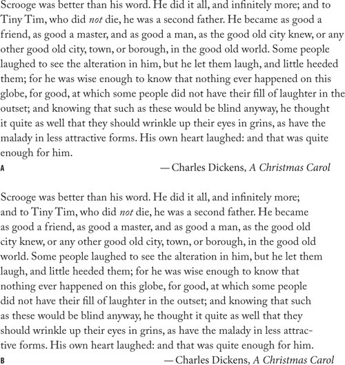 Figure 8.17. Balance Ragged Lines in body text. Both paragraphs are composed using the Adobe Paragraph Composer, and both permit hyphenation. Example A is without Balance Ragged Lines; example B has Balance Ragged Lines applied. Using Balance Ragged Lines for body text can yield unpredictable resultsit is best applied locally, or, if incorporated into a Paragraph Style definition, to paragraphs that typically run only a few lines.