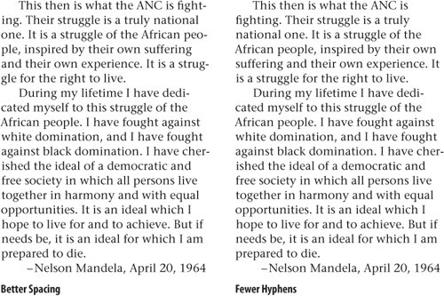 This enables you to alter the balance between better spacing and fewer hyphens. With justified text the spacing is adjusted between the words. With left-aligned text the rag (the right edge of the text) is adjusted. When working with left-aligned text avoid any gaping holes, long sloping edges, or words that stick out unattractively. Aim for a gentle wave that makes slight in-and-out adjustments as the eye travels down the column.