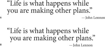 Figure 8.23. In example A, without the Indent to Here character the opening quote mark bites into the text block. Adding an Indent to Here character after the opening quotation (example B) allows the quote mark to "hang" in the left margin.