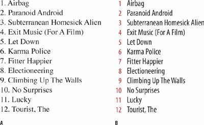 Figure 12.6. A numbered list before formatting (example A) and the same text using a right and a left tab (example B). Note that the periods after the numbers are redundant and have been removed. Using the Control palette or the PageMaker Toolbar to convert the text to a numbered list adds numbers before each paragraph, but does not add tabs or formatting. The numbers are staticthat is, they do not update should you change the order of the text.