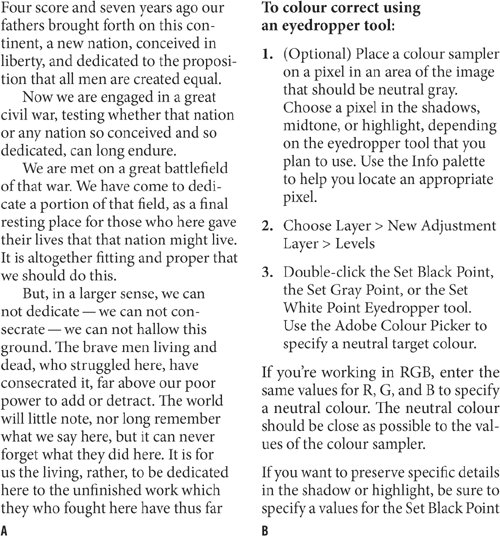 Figure 9.1. Two ways of differentiating paragraphs: First-line indents set to 1 pica for continuous reading text (example A) and Paragraph Spacing (example B) with a 6-point space above for more technical material.