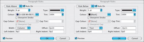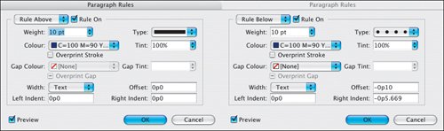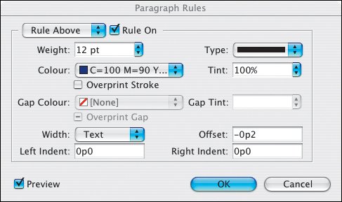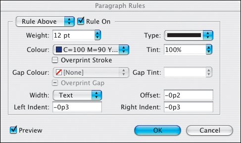 If you've ever drawn a rule above a line of text, only to have the text reflow and leave the rule in the dust, you'll find Paragraph Rules an invaluable feature. With Paragraph Rules you can add a rule above and/or below the text and have that rule move with the paragraph when the text is edited. No more chasing after the text to reposition those lines.