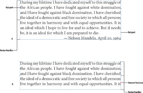 Figure 2.3. Anatomy of a Text Frame. A. Text frame containing a whole story. B. The same text frame resized so that the text is overset.