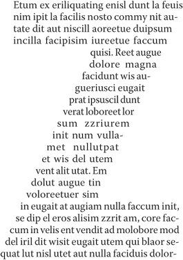 Every once in a while you might want to make the text wrap within the graphic shape, rather than around it. To do so, simply check the Invert box on the Text Wrap palette. This works best with simple shapes that allow for left-right reading of the text. It also helps if the type is a solid blockwithout paragraph breaks and indentsand tightly leaded and justified so that it better defines the object shape.