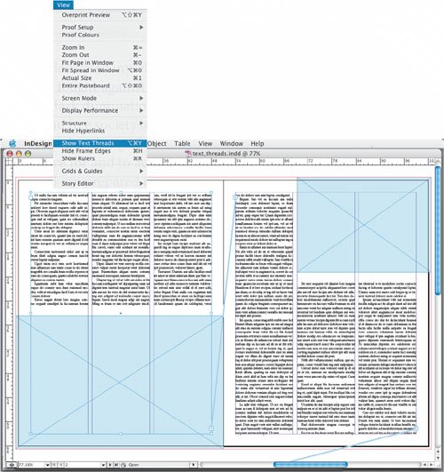 Figure 2.9. Empty Text frames threaded together and filled with placeholder text. Text Threads are shown.