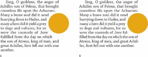 Figure 17.8. Wrapping around a circular shape. In example A, the text wrap at the poles of the circle is larger than that at its center. In example B, the Direct Selection tool is used to pull the text wrap offset at both poles toward the center of the circle letting the text hug the circle shape.