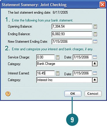 Type the ending balance and date from your statement, type any bank charges and interest, and select a category to associate with the charges and interest. Then click OK.