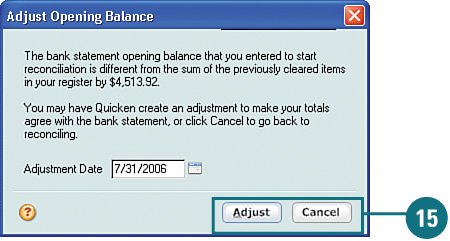 If the account did not balance and you clicked Finished instead of Finish Later, a message appears asking if you want for Quicken to adjust your balance to reconcile it. Click Adjust to adjust your balance or Cancel to return to the Statement Summary window.