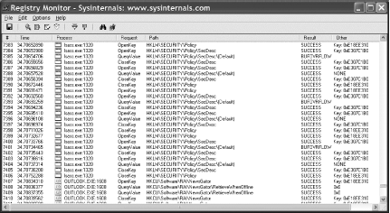Problem You want to monitor Registry accesses. This could involve anything from watching what processes are using the Registry to monitoring what a specific user is doing with the Registry. Solution There are two ways to monitor Registry activity. You can view real-time access to the Registry with the Sysinternals Registry Monitor (regmon.exe) tool. With it you can view the process name, the PID, and the operation performed (e.g., QueryKey, EnumerateValue, SetValue, etc.) for all the processes that have a key or value open. Figure 9-1 shows this tool. Figure 9-1. Sysinternals Registry Monitor  If you want to monitor Registry activity over a long period of time or cannot keep a copy of Registry Monitor open at all times, another option is to enable Registry auditing. With Registry auditing enabled, you can get detailed information in the Security event log about the successful or failed attempts a particular user or group of users make to the Registry. Here is how you set that up: Open the Registry Editor (regedit.exe). In the left pane, browse to the key you want to audit. (You can't audit individual Registry values.) Right-click on the key and select Permissions. Click the Advanced button. Click the Auditing tab. Click the Add button. Use the Object Picker to find the user or group for whom you want to audit access. In the Auditing Entry box, select the types of things you want to audit. Success is audited separately from Failure, so be sure to check all the types you want to audit. Click OK until all windows are closed. Open the Local Security Policy snap-in (available from Administrative Tools). In the left pane, expand Local Policies and click on Audit Policy. In the right pane, double-click on Audit object access. Check the box beside Success to audit successful actions. Check the box beside Failure to audit failed actions. Click OK. Discussion To enable auditing in the Registry, you have to complete two steps. The first consists of configuring what you want to audit in the Registry, which you can do with the Registry Editor. See Table 9-4 for the complete list of audit options. After you've completed this, auditing isn't turned on yet. To do that, you have to go to the Local Policies snap-in (or Group Policy Object Editor in a domain environment) and enable auditing as described above. At this point, any Registry access to the keys you configured should be logged to the Security event log. Table 9-4. Registry audit options| Audit name | Description |