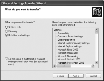 The "What do you want to transfer" screen appears next, as shown in Figure 4-9. You can choose to transfer settings, files, or both files and settings. Make your choice. You now have to choose what settings to transfer. The default is settings for applications and Windows such as taskbar options and Outlook Express, specific folders such as Desktop, Fonts, My Documents, and My Pictures, and file type associations (what files open with what programs). To add or remove settings, select the "Let me select a custom of files and settings" checkbox, and then click Next. Figure 4-9. You can transfer all the files and settings found by the Files and Settings Transfer Wizard, or else select from a custom list of your own