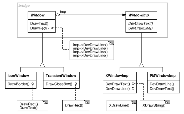 All operations on Window subclasses are implemented in terms of abstract operations from the WindowImp interface. This decouples the window abstractions from the various platform-specific implementations. We refer to the relationship between Window and WindowImp as a bridge, because it bridges the abstraction and its implementation, letting them vary independently.