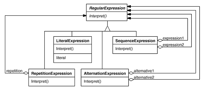 The Interpreter pattern uses a class to represent each grammar rule. Symbols on the right-hand side of the rule are instance variables of these classes. The grammar above is represented by five classes: an abstract class RegularExpression and its four subclasses LiteralExpression, AlternationExpression, SequenceExpression, and RepetitionExpression. The last three classes define variables that hold subexpressions.
