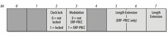 The service field, shown in Figure 14-5, contains control bits to help the receiver decode the frame. As discussed previously, bits 0, 1, and 4 are reserved and must be set to zero. In all 802.11g stations, the transmit and symbol clocks are locked, so bit 2 is always set to 1. Bit 3 is set when the frame body is modulated with PBCC, and set to zero for DSSS, CCK, and DSSS-OFDM modulations. The last three length extension bits are used to assist receivers in determining the frame length in bytes from the Length field, which is expressed in terms of the number of microseconds required for transmission. The standards have a complicated set of rules for when the bits must be set, but they are beyond the level of detail required for this book, especially since the single-carrier framing technique is uncommon.