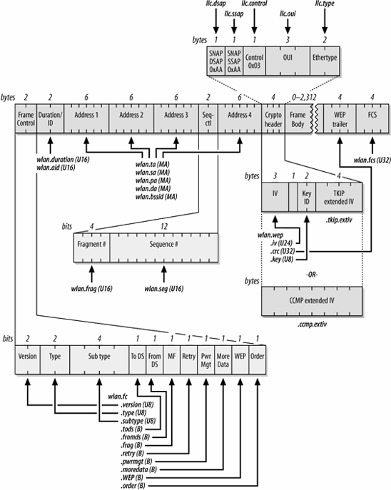 Display filters can be used on any field that Ethereal identifies, which makes them far more powerful than capture filters. Display filters inherit the knowledge of all the dissectors compiled into Ethereal, so it is possible to filter on any of the fields in any of the protocols that Ethereal is programmed to recognize. Wireless LAN administrators can filter frames based on anything in the 802.11 or LLC headers. Examples specific to 802.11 are presented later in this chapter.
