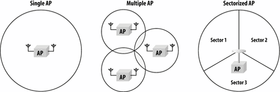 One way of measuring the quality of coverage is to consider the total aggregate throughput available to the service area, which is in many ways a reflection of the density of the access points. All other things equal, more access points mean that there is more radio capacity. Figure 23-3 shows three networks. On the left, there is a network with one access point. It is capable of offering up to, say, 30 Mbps of user payload data to clients in the service area. In the middle, there is a network built with three access points, operating on lower power. By separating the coverage area into independent radio cells, more throughput is available. Roughly speaking, there will be 90 Mbps available to serve clients. Finally, in the network on the right, there is a single access point with a sectorized antenna, which acts like three combined directional antennas. In some implementations, each sector is assigned its own channel, which also reduces the number of collisions between stations attempting to transmit. Done in the most sophisticated manner, each channel on the sectorized antenna will act like an independent access point, and the aggregate throughput available to clients will be 90 Mbps. Throughput quality may also be measured in terms of megabits available per square foot of service area, which is consistent with the total throughput available to the service area.