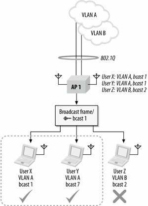 To separate traffic in the air between user groups, access points use multiple key sets. Upon authentication, every user is given a default (broadcast) key, and a key mapping (unicast) key. Broadcast domains are defined by the stations in possession of the same broadcast key. In Figure 21-8, the two users on the left are part of the same user group, and share the same broadcast key. When one sends, say, an ARP request, the other responds. Users who are part of a different broadcast domain are not able to decrypt and process the frame because they have a different broadcast key. Although user groups share the same radio capacity, they are not members of the same user group and remain separated over the radio network.