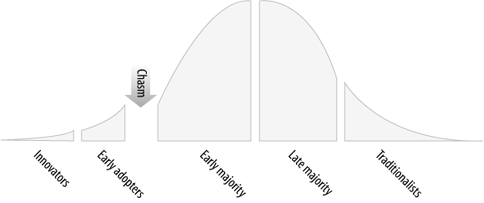 3.2. Open Source Skill Levels It is impossible to capture precisely and on a simple scale a detailed assessment of an IT department's open source skills. What's more, the skills required for any particular implementation can vary widely, depending on the maturity of the open source project. The goal of this model, then, is not to create an authoritative aptitude test, but rather, to help an IT department understand what skills are required to use open source projects in different situations. The Open Source Skills and Risk Tolerance model will serve four purposes: It is a guide to self-assessment that can combat the frequent over-optimism of IT departments and technologists in general. All technologists feel in their hearts like highly skilled innovators. The descriptions presented of the specific skills an IT department has to have at each level can assist in making a sober judgment about what sort of open source is appropriate. It gives the authors a quick way to talk about what sort of skill level will be needed in the later chapters that review specific open source projects. In understanding the skills required at each level, an IT department will be able to create an organized plan for creating and improving institutional skills so that the cost of using open source drops and the potential value created from using open source grows. If an IT department chooses to use consultants to help in evaluating and implementing open source, the model provides a framework for evaluating the skills of a consultant or consulting firm, or other service providers. 3.2.1. Skill Levels Defined The skill levels presented here are intended to imitate the stages of technology adoption made famous by Geoffrey Moore in his book, Crossing the Chasm. In the book, Moore presents a model for how technology is adopted based on a diffusion model that was first created to explain the adoption of technology in agriculture. In Moore's model, users of technology are split into the categories shown in Figure 3-1. Note how the size of the area under the bell curve illustrates the number of people in each category. Figure 3-1. Geoffrey Moore's categories for technology adoption  Moore's analysis is that between the early adopters and the early majority exists a chasm that companies selling technology have to cross over. The difficulty in crossing the chasm is that the way technology is adopted by innovators and early adopters is completely different from the way the early majority and late majority adopt technology. Moore has written several books explaining and expanding on this analysis, but here are his views in simplified form: Innovators and early adopters have a high tolerance for risk and for the defects of new technology, because they are highly skilled. Innovators and early adopters are attracted primarily to technology because of the power of its raw functionality. The early and late majority have low tolerance for risk and are interested not in raw functionality but in the acquisition of technology to solve specific business problems. Most high-technology companies start out selling to innovators and early adopters, emphasizing functional strengths and how innovative their technology is. This approach turns off the early and late majority. To "cross the chasm," companies must learn how to change their tune and package their product to solve specific business problems in a predictable, low-risk fashion. Much the same chasm exists in open source technology. But unlike commercial technology, few open source developers are attempting to push their projects across the chasm. This is changing as open source is used as a business model for consulting firms, and open source developers start to understand the benefits of wider adoption. (Chapters 6 and 7 address some of these issues.) Open source projects do not have marketing departments, sales staff, and product managers thinking about how to gain a wider audience. They have developers creating great technology to meet their own goals. For open source projects to cross the chasm, they must be either pulled across by IT departments that realize the benefits of increasing institutional skills to unlock the value of open source, or pushed by a person, group, or organization that is interested in wider adoption. This does not mean that to use open source an IT department has to become an innovator such as Google, Amazon.com, or Ticketmaster. It does mean that an IT department has to develop enough skill to recognize and implement mature open source that is ready to cross the chasm. This chapter will explain the kind of skills needed, using levels that are parallel to those in Moore's analysis: Each skill level enables an IT department to handle open source of different degrees of maturity. To be precise about our definition, each level of expertise will be described along each of the following dimensions: