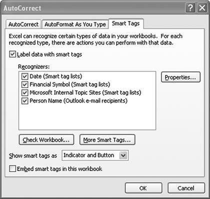 Smart Tags in Excel are managed from the Smart Tags page of the AutoCorrect dialog, as shown in Figure 16-6. The Smart Tags page can be displayed by choosing AutoCorrect Options from the Tools menu. Here the user can turn on and off individual recognizers as well as control other options relating to how Smart Tags display in the workbook.