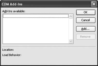 You can add COM add-ins by using the Add button and remove them by using the Remove button. Typically, you will not have your users use this dialog to manage COM add-ins. Instead, you will install and remove a COM add-in by manipulating registry settings with the installer you create for your COM add-in.