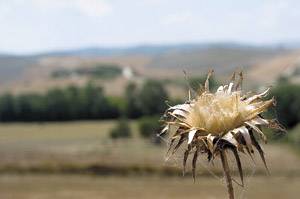 | For many photographers, depth of field just happens, and as long as it doesn't get in the way, they tend to ignore it. This is a huge mistake in that it is one of the most powerful in-camera creative tools at your disposal. Consider the creative options described in the following sections. Implying Distance Depth of field is a great way to imply vast areas of space within a photograph. A background that fades to a soft blur is a basic feature of atmospheric perspective, which was a compositional tool used by Renaissance painters. The background is soft and desaturated in many old master paintings as a way of implying a distant horizon. In Figure , the sunflower is in sharp focus as the background goes to a soft blur. Although this effect is rather abrupt, the blurred landscape in the background is easily identifiable and works to enhance the foreground subject. Dried Flower Nikon D2H 1/400 sec, f/10 Focal length 75mm