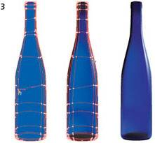 The finished blue bottle mesh in outline, hidden, and in Preview with details on a layer above  Once your mesh lines are in place, you can select individual or groups of points, or click in areas between points and adjust colors using the Color palette sliders. You can also click on a color swatch in the Swatches palette, or pick up colors from another object by clicking in on the color you want with the Eyedropper tool. Miyamoto used a photographic reference to help him decide where to place lights and darks. Creating finishing details. Although Gradient Mesh objects are an astoundingly flexible and powerful drawing tool, sometimes it's necessary to create details in layers above the mesh object. To make selections and isolated viewings of the various objects easier, create new layers for your detail objects above your mesh objects. For the blue bottle (in a layer above the mesh), Miyamoto created a few punctuations of color and light using objects drawn with the Pen tool, and filled with solid colors or custom gradients. For his beer bottle Miyamoto created type shapes, for the small milk bottle he added additional rim colors, and for the green wine bottle he added more reflections and a raised inner bottom.