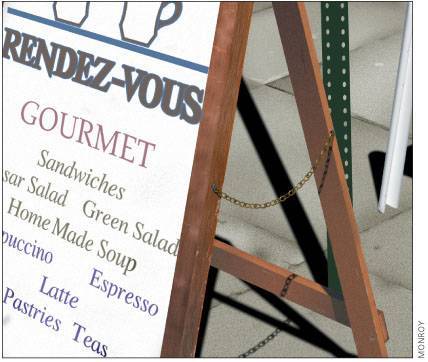 | Creating Details with the Pattern Brush Overview: Create interlocking chain links by drawing and cutting duplicate curve sections; select the link artwork and create a new Pattern brush; draw a path and paint it with the new brush.  One look at a Bert Monroy image and you will immediately recognize the intricacy and rich realism of his style of illustration. When crafting an image like the Rendezvous Cafe, Monroy travels between Illustrator and Photoshop, stopping long enough in Illustrator to construct the intricate shapes and details that turn his scenes into slices of life in Photoshop. The easel chain is one such detail that Monroy created in Illustrator using a custom-made Pattern brush. Drawing, cutting, copying, and reflecting curves. To build a chain-link Pattern brush, Monroy first created one link that was interconnected with half-links on either side (the half-links would connect with other half-links to form the chain once the Pattern brush was applied to a path). To create the pattern unit with the Ellipse tool, begin the center link by drawing an ellipse with a thick stroke. Copy the ellipse, Paste in Back; then turn the ellipse into a guide (View > Guides > Make Guides). You'll use this guide later when making the half-links. Now select the original ellipse and use the Scissors tool to cut the ellipse near each of the four control points (choose View > Outline to better see the points). Shift-select the four curved paths with the Direct Selection tool and select Object > Path > Outline Stroke. Illustrator automatically constructs four closed-curve objects.