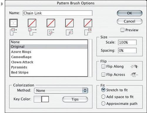 Finished link artwork; at the left, the links as Monroy created them; at the right, an alternative version of the interconnected links  Making and using a Pattern brush. To make the brush, select the artwork and drag it into the Brushes palette. Choose New Pattern Brush in the New Brush dialog box; in the next dialog box, name the brush and click OK (leave the default settings as you find them). You can now apply the chain pattern to a path by selecting the path and clicking on the brush in the Brushes palette.