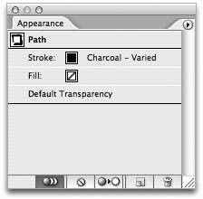 Applying Brush Strokes To paint with a brush, choose the Paintbrush tool from the Toolbox and then choose a brush from the Brushes palette. You create brush strokes the same way you create paths with the Pencil tool, so once you've selected a brush to use, click and drag on the artboard to define a path. When you release the mouse, Illustrator applies the brush stroke to the newly created vector path (Figure 5.5). Illustrator also indicates the applied brush stroke in the Appearance palette, making it easy to identify when a particular brush as been used (Figure 5.6). Figure 5.5. When you create a brush stroke, a single vector path is defined, and the appearance of that path displays the brush.  Figure 5.6. By identifying the brush applied to a path, the Appearance palette gives yet another reason for why it should always be opened on your screen.  You don't have to use the Paintbrush tool to apply a brush stroke to a vector path. Simply selecting a vector path and clicking a brush in the Brushes palette applies the brush to the selected path. The only benefit you gain by using the Paintbrush tool is the ability to define a brush shape using a pressure-sensitive tablet (see the Sidebar, "Can You Handle the Pressure?").  | If you double-click the Paintbrush tool, you'll find that the preferences are identical to those of the Pencil tool. |