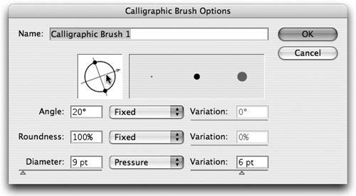 Defining a Calligraphic Brush To define a new Calligraphic brush, click the New Brush icon in the Brushes palette or select New Brush from the Brushes palette menu. Choose New Calligraphic Brush from the New Brush dialog and click OK to open the Calligraphic Brush Options dialog (Figure 5.7). Figure 5.7. The Calligraphic Brush Options dialog allows you to click and drag on the nib shape in the preview area to define its settings.  The Calligraphic Brush Options dialog allows you to specify the shape and behavior of the nib using three different settings: Angle. The angle of a Calligraphic brush can be set to a fixed angle or to a random number. When the roundness setting is at 100%, the angle setting does not produce any noticeable change in the shape of the brush. With pressure-sensitive tablets, you can set the angle to change based on pressure, stylus wheel, tilt, bearing, or rotation. When you're not using the fixed option, the Variation slider allows you to specify a range that the angle can change, which you can also see in the preview area of the dialog. Roundness. The roundness of a calligraphic brush can be set to a fixed or a random number. When the roundness is set closer to 100%, the tip of the nib becomes circular in shape (like a traditional ink pen). When the roundness is set closer to 0%, the tip of the nib becomes flat (like a traditional calligraphy pen). With pressure-sensitive tablets, you can set the roundness to change based on pressure, stylus wheel, tilt, bearing, or rotation. When you're not using the fixed option, the Variation slider allows you to specify a range that the roundness can change, which you can also see in the preview area of the dialog. Diameter. You can set the diameter, or size, of a Calligraphic brush to a fixed or a random number. With pressure-sensitive tablets, you can set the diameter to change based on pressure, stylus wheel, tilt, bearing, or rotation. When you're not using the fixed option, the Variation slider allows you to specify a range that the diameter can change, which you can also see in the preview area of the dialog.  | When you're using a pressure-sensitive tablet, giving the diameter setting a variation based on pressure enables you to create strokes that appear thicker as you press harder. If you have Wacom's 6D Art Pen, it makes sense to set the angle to the pen's rotation attribute. |