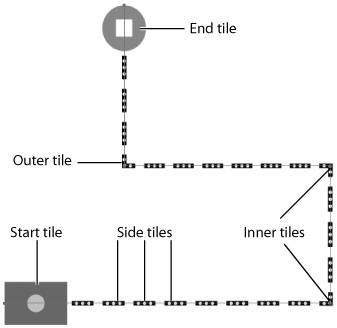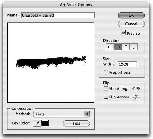 Colorization. The Colorization option lets you choose from one of four different settings. If you choose the None setting, the Scatter brush creates art in the same color that is used to define it. If you choose the Tints setting, the Scatter brush creates art in varying tints of the current stroke color. If you choose the Tints and Shades setting, the Scatter brush creates art in varying tints of the current stroke color while preserving black colored objects. If you choose the Hue Shift setting, the Scatter brush creates art and changes the key color of the art to the current stroke color. To define a key color, click the Eyedropper icon in the dialog and click on a part of the art in the preview area. Defining an Art Brush To define a new Art brush, start by creating the art for the brush on the artboard. Once it's complete, drag the artwork directly into the Brushes palette. Alternatively, you can select the art and click the New Brush icon in the Brushes palette or select New Brush from the Brushes palette menu. Choose New Art Brush from the New Brush dialog and click OK to open the Art Brush Options dialog (Figure 5.10). Figure 5.10. The Art Brush Options dialog gives you a visual preview of the direction that the art will appear in relation to the path.  Direction. The Direction setting determines the orientation of the art with respect to the path to which the brush is applied. A blue arrow appears in the preview area allowing you to visually understand how the art will be drawn on a path. Size. The Size setting determines how big or small the art is drawn on the path relative to the actual size of the art that was used to define the brush. For example, if you create a design that is 1 inch tall and use it to define an art brush, a size setting of 50% results in an art brush that creates designs that are .5 inches tall. When specifying width values, you can also choose to keep the artwork scaled in proportion. Flip. The Flip Along and Flip Across settings enable you to reflect the artwork on both the horizontal and vertical axis. Colorization. The Colorization option lets you choose from one of four different settings. When you choose the None setting, the art brush creates art in the same color that is used to define it. If you choose the Tints setting, the Art brush creates art in varying tints of the current stroke color. If you choose the Tints and Shades setting, the Art brush creates art in varying tints of the current stroke color while preserving black colored objects. If you choose the Hue Shift setting, the Art brush creates art and changes the key color of the art to the current stroke color. To define a key color, click the Eyedropper icon in the dialog and click a part of the art in the preview area. Defining a Pattern Brush To define a new Pattern brush, you must first define the pattern swatches that will be used in the brush, using the methods you learned in Chapter 2, Vectors 101. A Pattern brush can contain up to five different pattern tiles, used for different parts of a path (see the Pattern Tiles bullet below). Once you've defined the necessary pattern swatches, click the New Brush icon in the Brushes palette or select New Brush from the Brushes palette menu. Choose New Pattern Brush from the New Brush dialog and click OK to open the Pattern Brush Options dialog (Figure 5.11). Figure 5.11. Though it might appear complicated at first, the Pattern Brush Options dialog makes it easy to define powerful Pattern brushes.  Pattern Tiles. A Pattern brush can use up to five different pattern tiles for the different parts of a drawn path. The side tile is used along the middle of the path, the outer and inner corner tiles are used whenever the path encounters a corner anchor point at 90 degrees, and the start and end tiles are used at the beginning and end of an open path (Figure 5.12). To set a tile, click the preview box above each tile and choose from the list of defined pattern swatches. Only pattern swatches from the current document appear in the list. It is not necessary to assign a pattern swatch to every tile in order to define a Pattern brush. For example, some Pattern brushes do not have start or end tiles defined. Figure 5.12. A Pattern brush can contain up to five different pattern tiles, which apply to side, outer and inner, and start and end points of a path.