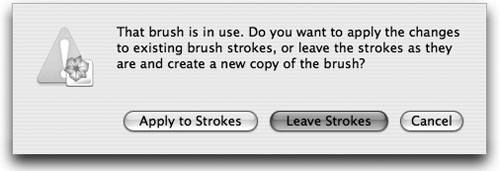 Modifying Brush Strokes Double-click any brush in the Brushes palette to specify or change its settings. Alternatively, you can hold the Option (Alt) key while dragging vector art from the artboard onto an existing Art or Scatter brush to modify or replace the brush. When you do, a thick black line appears around the brush icon indicating that you are about to modify it. When you're about to modify a brush, Illustrator checks to see if the existing brush has already been applied to objects in your document. If it finds such objects, Illustrator asks if you want the existing paths to now take on the appearance of the modified brush, or if you want to leave them intact. If you want to leave them intact, Illustrator makes a copy of the modified brush rather than replace the existing one (Figure 5.13). Figure 5.13. Always watching what you're doing, Illustrator alerts you if your edits will affect objects that have already been drawn.  You can delete brushes from a document by dragging them to the trash icon in the Brushes palette. If you try deleting a brush that is already applied to an object in your file, Illustrator prompts you asking if you want to either expand the path, remove the brush appearance from the path altogether, or cancel. Expanding Brush Art When you apply a brush stroke to a path, only the vector path itself is editable. The art that makes up the brush stroke cannot be edited or otherwise tinkered with. However, you can easily reduce any brush stroke to editable vector art by choosing Object > Expand Appearance. Doing so removes the link to the brush and the path no longer updates if the brush swatch is updated.  | Like swatches, brushes travel with a file, so you don't need to expand a brush just because you're sending the file to someone else. When you define and use brushes, those brushes are saved in the file and are there until you manually delete them. |
