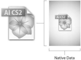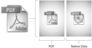 In reality though, Illustrator's native file format is a special flavor of the PDF languagea flavor that only Illustrator can understand. There are certain constructs that exist in Illustrator but that do not exist in the PDF language, such as live blends, Live Paint, and Live Effects (these effects are all expanded when printed or translated to regular PDF). You can think of Illustrator's native file format as a superset of the PDF language. If this is the case, however, how is InDesign or Acrobat able to import and display native Illustrator files? That's where the dual path concept comes in. When you save a native file, Illustrator embeds two filesa native Illustrator file (.ai) and a standard PDF file (Figure 12.1). When you place the native Illustrator file into InDesign, the application sees the PDF portion of the file and uses that for display and printing. When you reopen the file in Illustrator, the application sees the native Illustrator portion and uses that for editing. In the end, everyone is happy, and you get to work with a single file. Figure 12.1. When you save a native Illustrator file, you're really saving two files. The PDF file that is created with the native Illustrator file is PDF 1.4, which preserves transparency.  To save your file as a native Illustrator file, choose File > Save and select Adobe Illustrator Document from the pop-up menu. When you click Save, you are presented with the Illustrator Options dialog where you can specify settings for how your file should be saved. These are described in the section, "Native Illustrator File Format Settings."  | The two files within an Illustrator file print and display the same and are exactly identical except the native Illustrator version maintains more editability within the Illustrator environment. |