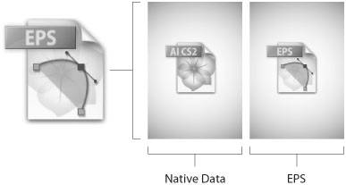 Include Linked Files. When you choose the Include Linked Files option, any place-linked files are embedded in your document. Although this means you can send the file to someone without requiring any external links, it also means that you can't easily update linked graphics anymore. This option also increases file size because the images are now included within the file. Embed ICC Profiles. The Embed ICC Profiles option includes any color profiles (including those from placed images) within your document. Use Compression. The Use Compression option employs compression algorithms to your file to try to reduce file size. Transparency. When you're saving back to Illustrator 8 or Illustrator 3 formats, transparency flattening must occur in documents that contain transparency effects. You can choose to discard the transparency effects completely (which preserves path geometry) or you can choose to preserve the appearance of your file. You can also choose from the list of available Transparency Flattener presets. For more information on which flattener preset to use, refer to Chapter 11. The Encapsulated PostScript (.eps) Format When Adobe introduced PostScript to the world, it forever changed the face of design and publishing. Since desktop publishing became a buzzword, the format in which designers and printers exchanged file information was always EPS. To this day, EPS is a reliable universal format that can be used to reproduce graphics from just about any professional (and even some nonprofessional) graphics applications. You can even use EPS files with video applications like Adobe After Effects. As you learned in Chapter 11, PostScript doesn't support transparency, so if your file contains any transparency effects, those effects are flattened when the document is saved as EPS. However, you can still reopen and edit the native transparency in Illustrator CS2 because Illustrator also uses a dual path when saving EPS files. An Illustrator CS2 EPS file has two portions within it: a native version for editing within Illustrator, and an EPS version that other applications, like QuarkXPress, use (Figure 12.4). Figure 12.4. When you save a document as an EPS file, Illustrator also embeds a native version of the file so that you can reopen and edit the file in Illustrator again with no loss in editability.  To save your file as an EPS file, choose File > Save and select Illustrator EPS from the pop-up menu. When you click Save, you are presented with the EPS Options dialog where you can specify settings for how your file should be saved, as described later in the section, "EPS File Format Settings." Using Legacy EPS Formats As with native files, Illustrator CS2 allows you to save your file so that it is compatible with a variety of versions of Illustrator EPS. This setting affects both the native portion and the EPS portion of the file. When you save a file that is compatible with an older version of Illustrator, both the native data and the PostScript are written so they are compatible with that version (Figure 12.5, next page). Obviously, the older the version you specify, the less editable your file is. Figure 12.5. When you save a file in Illustrator 8 EPS format, the native portion of the file is also saved in Illustrator 8 format, which doesn't support transparency. Even if you reopen the file in Illustrator CS2, any transparency that was in the file is flattened.  The same rules mentioned for native Illustrator files apply here (with regard to versions that result in loss in text and transparency editability), and it always makes sense to save an Illustrator CS2 EPS for your own needs and deliver older or legacy EPS versions for others, as needed. EPS File Format Settings A variety of settings are available in the EPS Options dialog (Figure 12.6), and depending on your needs for each particular workflow, you can make adjustments to these settings. Figure 12.6. The EPS Options dialog offers a variety of setting to choose from when you're saving an EPS file, including the type of preview that you want saved within the file. Version. The Version pop-up menu allows you to choose which version of Illustrator EPS you want your file to be compatible with. See preceding section, "Legacy EPS Formats," for more information. Preview. The Preview setting lets you choose from different options for embedding a preview in your EPS file. Because most programs can't display PostScript on your computer screen, a low-resolution preview is stored along with the file so that programs like QuarkXPress or Microsoft Word can give you a visual representation of what the file will look like in your layout. Transparency. If your file contains transparency, your file must be flattened so that it can be saved in PostScript and printed from another application (remember, the version you choose determines if the native portion of the file, which Illustrator reads when it reopens the file, still contains editable unflattened data). Although you can choose from different Transparency Flattener presets from the pop-up menu, it almost always makes sense to choose the High Resolution setting, because you'll always want to get the best possible results when printing the EPS from other applications (see "File Formats and Workflow" later in this chapter). Embed Fonts. When this option is checked, any fonts used are embedded in the EPS portion of the file. This allows other applications to print the file without requiring the fonts. However, even with the setting turned on, you still need the fonts installed if you are going to reopen the file within Illustrator. Fonts with permission bits turned on can't be embedded (see the sidebar entitled "Font Embedding and Permissions" later in this chapter). Include Linked Files. Choosing the Include Linked Files option embeds any place-linked files in your document. Although this means you can send the file to someone without requiring any external links, it also means that you can't ea