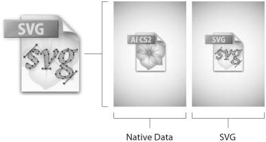 Images. When you save a file in SVG, you have the ability to embed any images within the SVG file (making for larger, but self-sufficient files), or you can choose to create smaller SVG files by using the Link option. Preserve Illustrator Editing Capabilities. The Preserve Illustrator Editing Capabilities option embeds a full native Illustrator file within your SVG file (Figure 12.20). This allows Illustrator to reopen and edit the file with no loss in editability. This option is unchecked by default, but turning this option on effectively doubles your file size. If you do leave this option off, make sure to always save a copy of your file because you won't be able to reopen the SVG file and edit it as a fully editable file. Figure 12.20. Similar to a PDF file, Illustrator can embed a native version of the file within an SVG document to assure editability when the SVG is reopened in Illustrator.