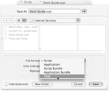 | 2.2.3. Plain Text Documents If you choose Text from the File Format pop-up menu, you'll get a file that ends in .applescript. This extension signifies that the script is nothing more than a plain old text file. Even though you can double-click the file's icon to open it in Script Editor, you can also drag the file into TextEdit, BBEdit, Microsoft Word, or any other text-processing program. "But why would I save a script as a text file when I can just save it as an application?" you ask. The biggest benefit is that it creates a teeny, tiny file, as shown in Table 2-1. If you want to send a big script as an email attachment, a plain text file is much quicker to download than an application. And once your friend has downloaded the .applescript file, she can open it in Script Editor and re-save it as either a script file or an AppleScript application. There's one more benefit to using a plain text file: Windows and Mac OS 9 users can open it, too. Just choose Windows Line Endings in the Save dialog box, and send the script to all your Mac- and PC-using friends. (Of course, Windows people can't run the AppleScript file, but at least they can see the beauty of your code.) | Power users' Clinic Bundling Files | As mentioned earlier, there are two other formats that AppleScript supports: Script Bundles and Application Bundles. The point of using a bundle is that all the auxiliary files that your commands use (movies, images, sounds, and so on) can be hidden from view, stored inside the script or application. Then, if you choose to distribute your script over the Internet, you can be sure that all the auxiliary files get distributed as well. Once you save a file as a bundle, you can crack it open in the Finder by Control-clicking its icon and choosing Show Package Contents from the shortcut menu. Then navigate to the Contents Resources folder, and drop any files there. Now, when you launch the script, it'll have direct access to those files (using the path to me command, described on Section 8.3.4). The best part of this arrangement is that you can move your bundle aroundon your hard drive or over the Internetand keep all the files intact. You can even rename the bundle itself (but not the files inside), and the script or application will still work properly. |