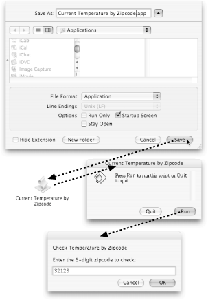 2.2.2. Applications An application, is a double-clickable program that gets saved with a .app file extension. (Of course, when you view an AppleScript application in the Finder, you'll likely notice that its extension is hidden, just like all the other applications in your Applications folder.) With Script Editor, you can create your own applications using AppleScript code. For example, you could take the Current Temperature by Zipcode script (Section 1.1.7), save it as an application, and then run it just by double-clicking its Finder icon.  | Figure 2-7. Top: Choose Application from the File Format pop-up menu, and select any options you'd like from the bottom. Turning on Run Only will keep other people from reading your code, while turning on Stay Open will keep your program running even after it's done with its commands.Middle left: When you click Save, you get a double-clickable icon.Middle right: If you turned on the Startup Screen option, the application will present a dialog box before it runs its commands. Bottom: When you click Run, your application finally runs its code. |