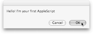 3.1. Getting Started Just as you can't surf the Web without a Web browser, you can't create AppleScripts without a script-editing program. The aptly named Script Editor (in your Applications AppleScript folder) is the simplest program for the job, but feel free to try any of the other editors listed on Sidebar 2.6. Before you start diving into the following sections, the first thing you'll need to do is launch Script Editor (Chapter 2). With this blank scripting slate before you, it's possible to accomplish such neat tasks as: Displaying a dialog box using a single line of code (see below) Performing basic arithmetic (see the next page) Getting the contents of your Clipboard (the place where Mac OS X stores information when you choose Edit Cut or Edit Copy [see the next page]) But that's only the beginning. So strap on that beanie with the propeller on top, and get ready to write your first lines of AppleScript. 3.1.1. Displaying a Simple Dialog Box As you saw on Section 1.1.4, dialog boxes are the most common way for AppleScript to interact with you. That's because, on their own, scripts can't display complex interface elements like pop-up menus, checkboxes, or toolbars. As you're starting out in AppleScript, therefore, you'll use the display dialog command even more than you breathe. Here's how: With Script Editor open, type the following command in the Script Field: display dialog "Hello! I'm your first AppleScript." As you type in the command, you'll notice it appears as a bunch of purple text. That's Script Editor's way of telling you that it hasn't checked your command for AppleScript compliance yet. Click the Compile button. That tells Script Editor, "Make sure I didn't make any typos in my AppleScript commands" (Section 2.1.1.4). Click Run. Under the hood, AppleScript sees your display dialog command and realizes that it has to put together a dialog box with your provided text. After a fraction of a second, you see the fruits of AppleScript's labor (Figure 3-1).  | If you don't see that dialog box, see Table 14-1 for an explanation of what may have gone wrong. |