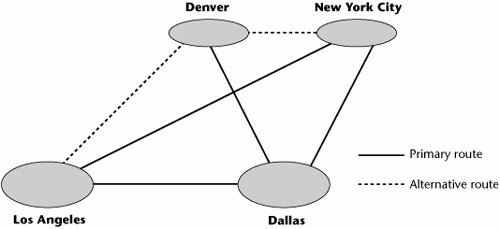 A second way in which you can use T-, E-, or J-carrier facilities is to build a private network. For example, if you use a T-1/E-1 to tie together two of your own locations, you can basically do as you wish with that pipe. You're in control of it, and you have the intelligent equipment at either end that can manage it on your behalf. For example, you can dynamically assign bandwidth; you can allocate only as much capacity as is necessary for an application, which more efficiently uses the capacity available on the digital facility. When you use a T-1/E-1 to build a private network, you can also perform dynamic alternative routing. For example, in Figure 7.9, the primary route between Los Angeles and New York City is the direct diagonal line between them. But say there is a problem and that link fails. The multiplexer in Los Angeles will be smart enough to know to reroute its highest-priority traffic through Denver to get it to New York. And in Denver, it may reduce the second-priority traffic to third priority in order to make room for the incoming high-priority traffic from Los Angeles. When the primary link is recovered, the network will revert to the original routing mechanisms. Dynamic alternative routing is useful in the face of congestion, failure, and a customer's need to reconfigure capacities based on activities and personnel at given locations at random times.