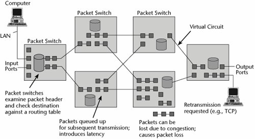Generally, in packet switching, packets from many different sources are statistically multiplexed and sent on to their destinations over virtual circuits. Multiple connections share transmission lines, which means the packet switches or routers must do many more routing calculations. Figure 3.5 illustrates a packet-switched network that uses virtual circuits. Packets are queued up at the various nodes, based on availability of the virtual circuits, and this queuing can impose delays.