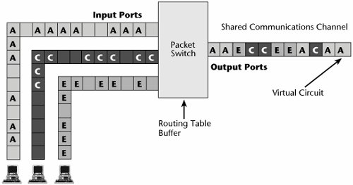 Remember from Chapter 3 that packet switching deals with containerized, labeled entities we generically call packets, which vary in size. Packets come from different sourcesfrom different users at one customer site or from different users at different customer sites. All these different packets are statistically multiplexed and sent to their destinations over virtual circuits. Also remember from Chapter 1 that a virtual circuit is a set of logical connections that create a pathway between two points; they are not a physical connection that you can trace end to end that belongs to just one conversation. A virtual circuit is therefore a shared communications link that is set up on demand based on negotiated communications parameters.