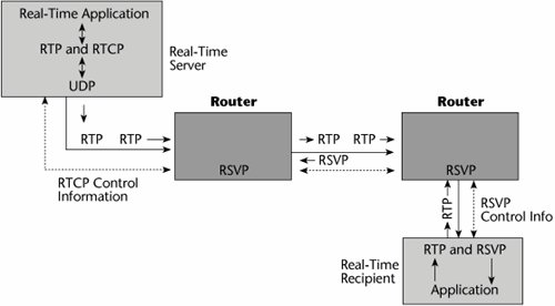 Several other protocols are associated with RSVP (see Figure 10.13). Real-Time Transport Protocol (RTP) is for audio, video, and so on. It is based on UDP, to cut down on overhead and latency. RTP is specified as the transport for H.323, and receivers can sequence information via the packet headers. Real-Time Transport Control Protocol (RTCP) provides status feedback from senders to receivers. Both RTP and RTCP are standardized by the ITU under H.225. Real-Time Streaming Protocol (RTSP) runs on top of IP Multicast, UDP, RTP, and RTCP.
