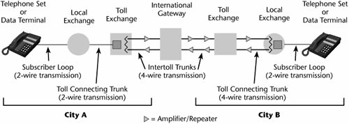 Network builders had to give some thought to another aspect of amplifiers: First-generation amplifiers were unidirectional. They could only amplify a signal moving in one direction, so to provision a circuit that was going to be crossing a distance, it was necessary to literally provision two circuitsone to amplify the information in the transmit direction and a second to amplify the information in the receive direction. Therefore, whenever a network was crossing a distance, it needed to use a four-wire circuit. But in building the millions of local loops for subscribers, it was seen as being cost-effective to pull only two wires into every home rather than four. Therefore, the local loops were intentionally engineered to be very short; some 70% to 80% of the local loops worldwide are less than 2 miles (3.2 km) long. Because the local loops are short, they don't need amplifiers, and therefore the subscriber access service can be provisioned over a two-wire circuit. However, the local loop is increasingly being digitalized, so as we migrate to an end-to-end digital environment, everything becomes four-wire. Figure 1.3 shows an example of a segment of a network in which two- and four-wire circuits are traditionally used.