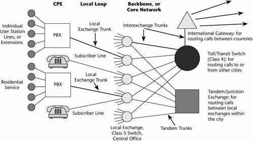 A trunk supplies the connections between the numerous switches within the PSTN, between customer-owned switches such as the PBX, and between the PBXs and the PSTN. On the other hand, a line supports a single user in the form of a subscriber line in the PSTN or an extension provisioned from the PBX. (Chapter 4 describes in detail the entities involved in managing local, tandem, and toll exchanges.)