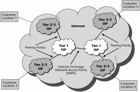 In an Internet-based VPN (see Figure 9.11), smaller ISPs provide local access services in defined geographical regions, requiring an enterprise to receive end-to-end services from multiple suppliers. An Internet-based VPN uses encryption to create a form of closed user group, thereby isolating the enterprise traffic and providing acceptable security for the enterprise across the public shared packet network. However, because it involves multiple ISPs in the delivery of the VPN, the performance is unpredictable. The biggest problem of having multiple suppliers is the inability to define and meet consistent end-to-end bandwidth or performance objectives.