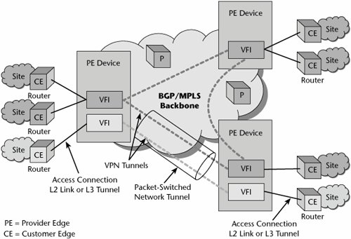 The customer site is a local private networkthat is, a set of communication devices that do not use a shared backbone to communicate with each other. The edge devices of a site, the customer edge routers, are connected to one of the service provider's provider edge devices via an access connection or attachment circuit through the access network. An access connection in this context is a dedicated Layer 2 connection, such as an ATM virtual circuit, a Frame Relay data link connection identifier (DLCI), a PPP connection, an Ethernet interface, or a virtual LAN. It could also be a Layer 3 tunnel, such as an IPsec security association over the Internet. The customer edgetoprovider edge access connection is configured to be associated with the specific VFI in the provider edge, depending on which VPN the site belongs to.
