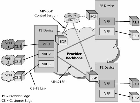 IP VPNs based on RFC 2547 are becoming increasingly popular. As shown in Figure 9.23, they use a combination of BGP and MPLS to pass IP traffic through an MPLS core. Offering this type of VPNs requires a provider to configure MPLS on all core and edge routers. Furthermore, all provider edge routers need to have Multiprotocol BGP (MP-BGP) sessions established between them to communicate VPN information. The provider edge routers store the routing updates from each customer's customer edge router in what is termed a virtual routing forwarding (VRF) instance; simply put, it is a routing table populated with VPN routes.
